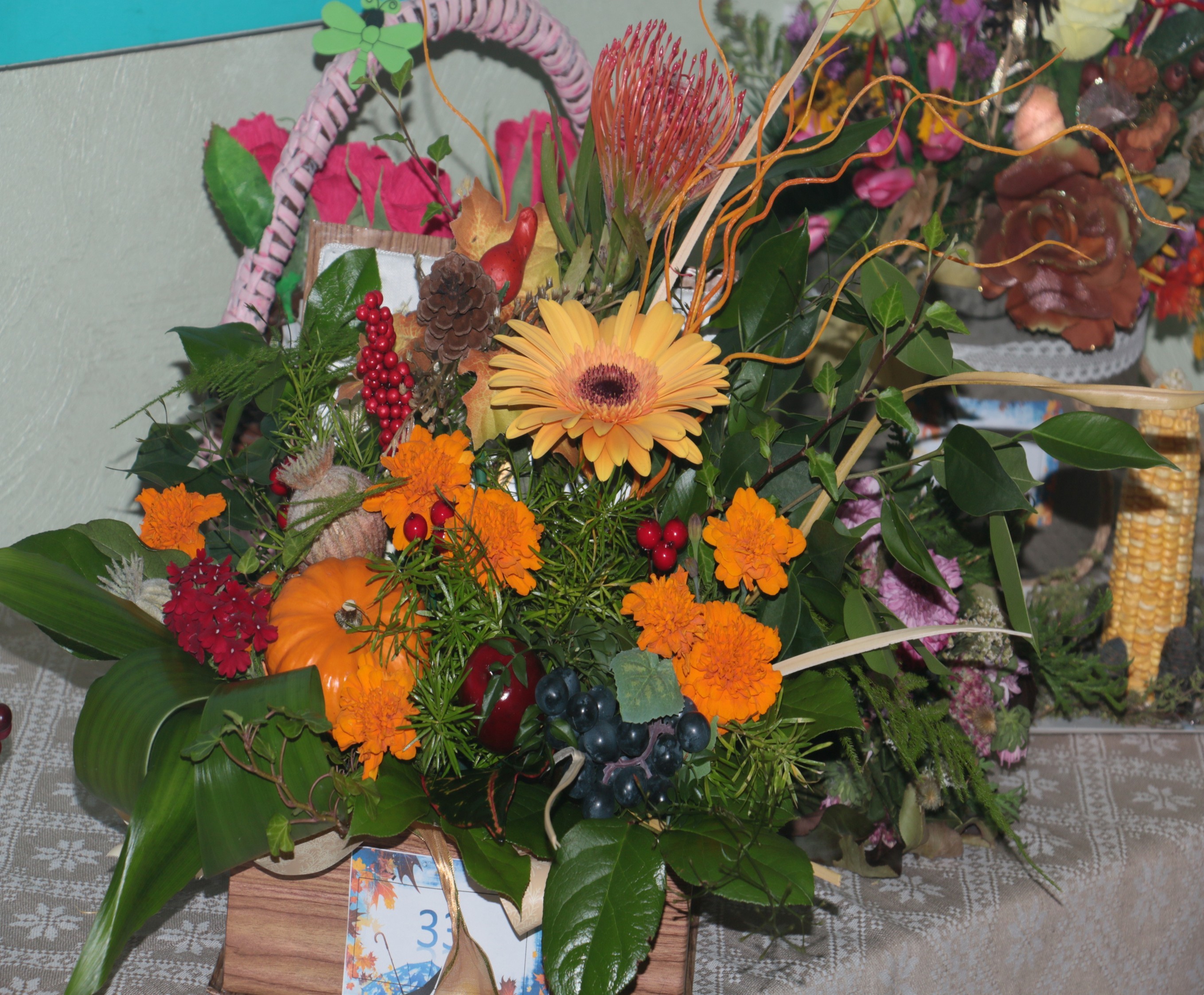 Традиционно в праздничную неделю группы конкурируют между собой в изготовлении осеннего букета. Смотрите что у нас получилось – фотографии выставки – конкурса «Все краски осени в под...
